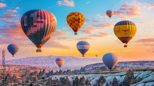 © Sakdecha, Fototapeta premium Vibrant hot air balloons over Cappadocia