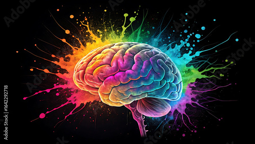 Fototapeta premium Vibrant Human Brain Exploding with Colorful Paint Splatters mind psychology