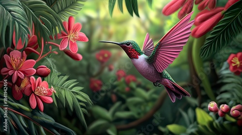 © ms25designs, Obraz premium Vibrant hummingbird amidst a tropical flower garden