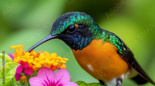 © Sudarat, Obraz premium Vibrant Hummingbird Feeding on Colorful Flowers in Nature