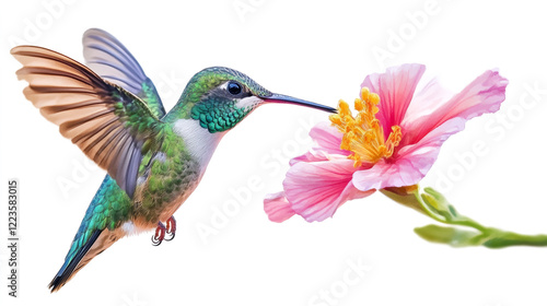 © CreativeSuburb, Obraz premium Vibrant hummingbird hovering near pink hibiscus flower
