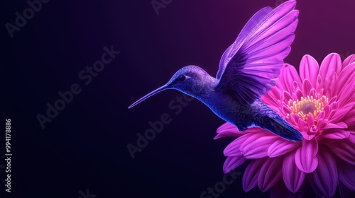 © Template_Design, Fototapeta premium Vibrant hummingbird hovering over a colorful flower, dark background.