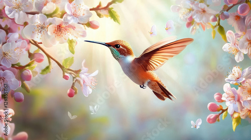 © chayapon, Fototapeta premium vibrant hummingbird hovers gracefully among colorful blossoms, its delicate wings shimmering in soft sunlight. lush floral background and gentle butterflies create dreamy, serene atmosphere