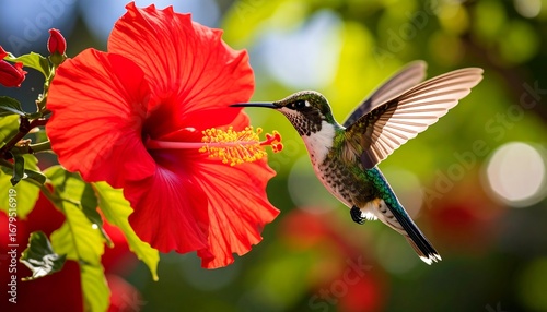 © Sofyan, Fototapeta premium Vibrant hummingbird hovers near a crimson hibiscus flower