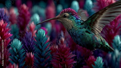 © Ajaz, Fototapeta premium Vibrant Hummingbird in a Fantasy Botanical Garden