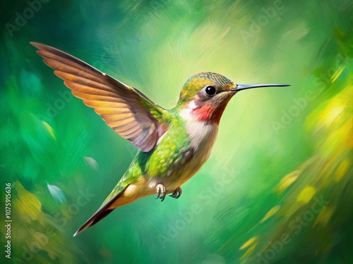 Fototapeta premium Vibrant Hummingbird in Flight Against a Green Brush Stroke Background,...