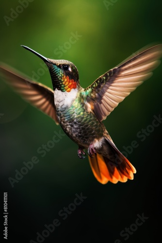 Fototapeta premium Vibrant hummingbird in flight against blurred green background