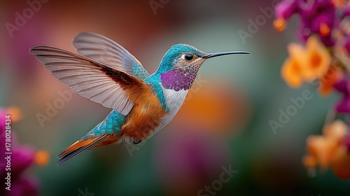 Obraz premium Vibrant Hummingbird in Flight Amidst Colorful Flora, Capturing Nature's...