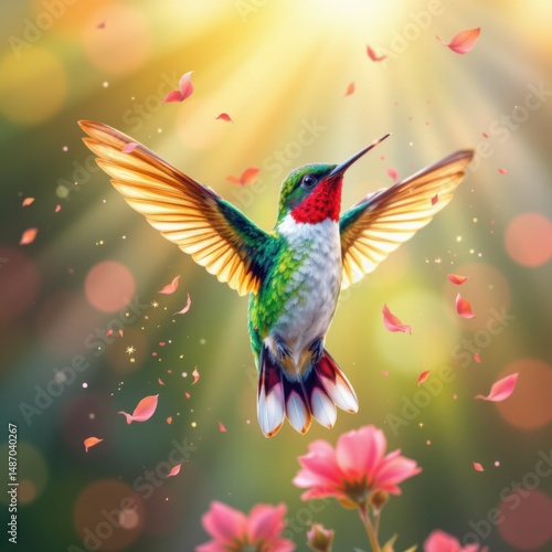 © Anuphong, Obraz premium Vibrant Hummingbird in Flight Amidst Pink Blossoms and Sunlight