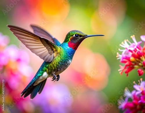 Fototapeta premium Vibrant hummingbird in flight among colorful flowers