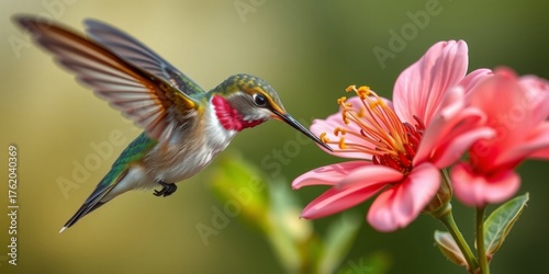 © Chom, Fototapeta premium Vibrant Hummingbird in Flight Approaching Colorful Pink Flower Displaying Delicate Beauty of Nature's Pollinators