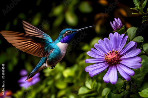 © Siasart, Obraz premium Vibrant Hummingbird in Flight, Approaching Purple Flower, Detailed Wings and Feathers, Dramatic Background