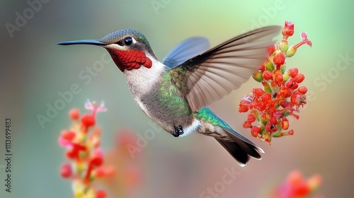 Fototapeta premium Vibrant hummingbird in flight, feeding on red flowers.