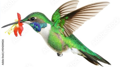 Obraz premium Vibrant hummingbird in flight, holding a flower.