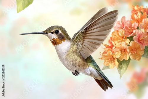 © Purple_Lamp, Fototapeta premium Vibrant Hummingbird in Flight Near Colorful Blossoms