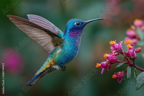 Obraz premium Vibrant hummingbird in flight, near pink flowers