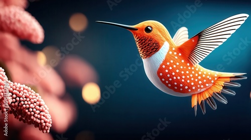 © Habibur614, Obraz premium Vibrant hummingbird in flight near pink flowers with blurred background