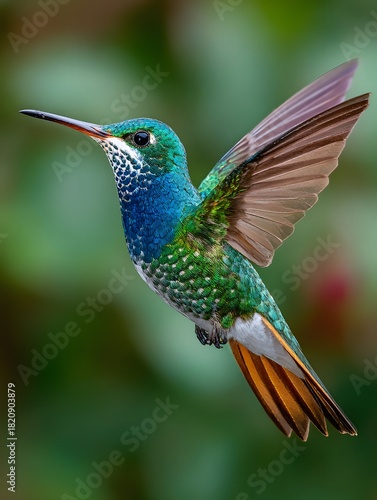 Fototapeta premium Vibrant hummingbird in flight showcasing iridescent green blue feathers with...