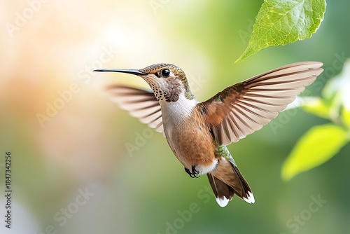 © nilawan, Fototapeta premium Vibrant Hummingbird in Mid-flight Captured Against a Soft Green Background