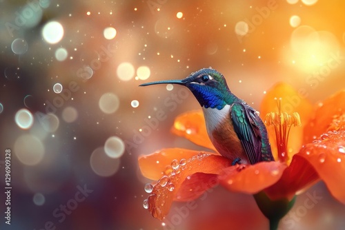 © malayeka, Obraz premium Vibrant hummingbird perched on a dew-kissed orange flower. (1)
