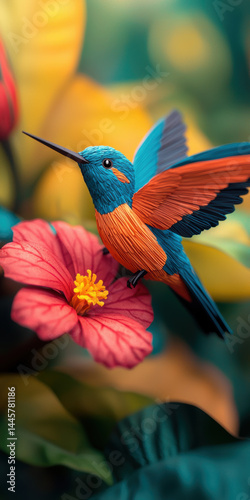 Fototapeta premium Vibrant hummingbird perched on colorful flower, showcasing intricate details...