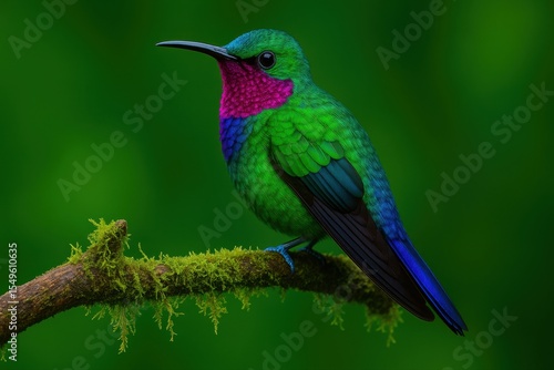 Fototapeta premium Vibrant hummingbird perched on mossy branch in green forest