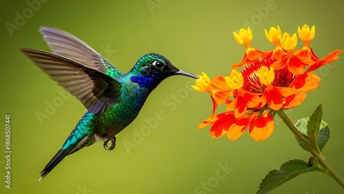 Fototapeta premium Vibrant hummingbird sips nectar from colorful flowers in flight animal wonder