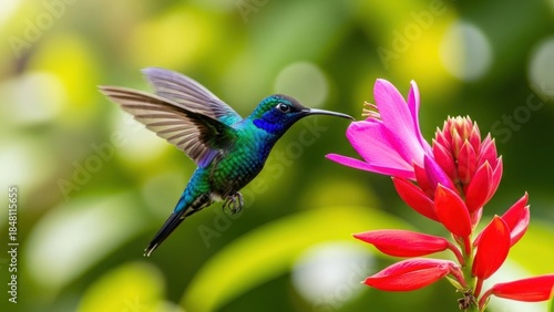 © Nimra, Naklejka premium Vibrant hummingbird sips nectar from colorful tropical flower
