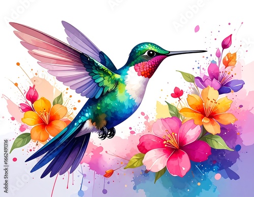© gelas, Obraz premium Vibrant hummingbird surrounded by colorful flowers