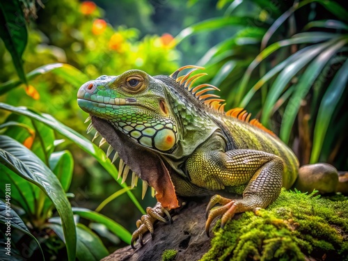 Obraz premium Vibrant Iguana Resting on a Rock Surrounded by Lush Green Foliage in a...