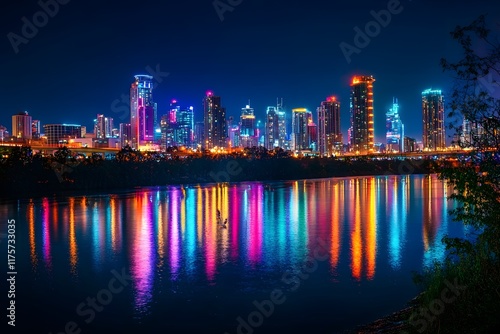© ruangrit19, Naklejka premium Vibrant Illuminated Cityscape Reflecting on Water at Night
