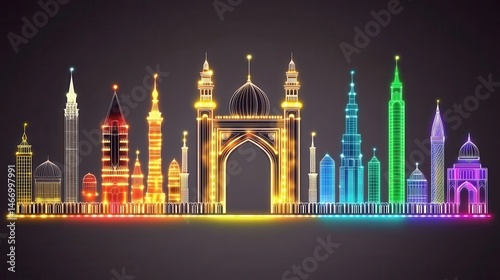Fototapeta premium Vibrant illuminated cityscape silhouette glittering on a dark background modern urban skyline with iconic landmarks and architectural wonders