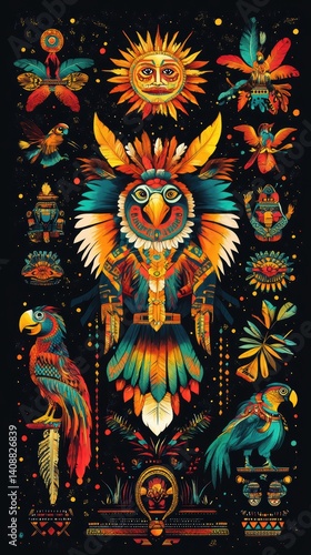 Fototapeta premium Vibrant Illustrated Artwork of Birds and Sun on Black Background