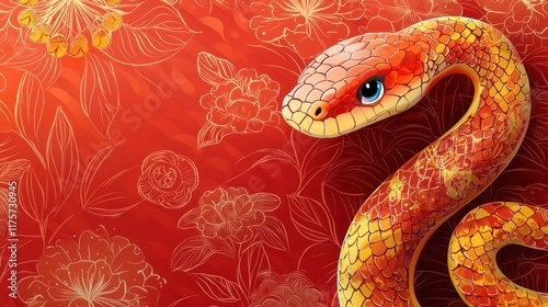 © Thanyaporn, Fototapeta premium Vibrant Illustration of a Colorful Snake Surrounded by Floral Patterns on a Red Background, Ideal for Nature and Wildlife Themes