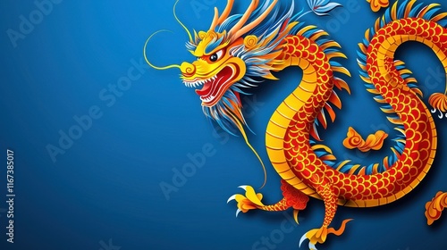 Obraz premium Vibrant illustration of a dragon on a blue background, showcasing intricate details and colors. Chinese New Year concept