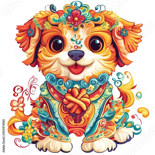 © Samaphon, Obraz premium Vibrant illustration of an adorable, decorative puppy with colorful patterns and charm.