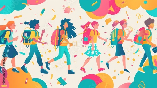 © Mrzproducer, Fototapeta premium vibrant illustration of diverse travelers carrying backpacks, enjoying a festive atmosphere with colorful shapes and confetti.