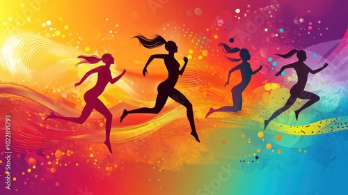 Naklejka premium Vibrant illustration of silhouetted women running against a colorful abstract...