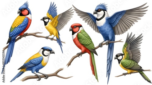© Ripon Mia, Obraz premium Vibrant illustration of six colorful parrots and macaws on branches