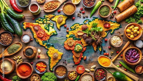 © Sirinporn, Fototapeta premium Vibrant illustration of South America's map covered with various traditional dishes, exotic fruits, and spices, showcasing the region's rich culinary diversity and cultural heritage.