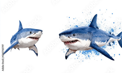 Obraz premium Vibrant Illustration of Two Sharks Swimming with Dynamic Splash Effects on a White Background for Creative Projects and Marine Life Themes