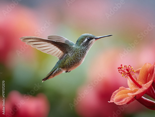 © SolaruS, Obraz premium Vibrant image of a hummingbird in flight, approaching a flower. Represents agility, nature, beauty, and delicate balance. Great for ecology, wildlife, and inspirational themes.