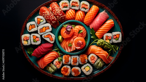 © Aghavni, Fototapeta premium Vibrant images of fresh sushi rolls, arranged artfully on a plate. Generative AI