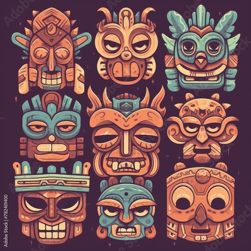 Naklejka premium Vibrant Indigenous Masks and Symbols from Mayan and Hawaiian Cultures...