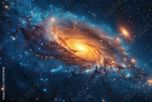 Fototapeta premium Vibrant indigo orange spiral galaxy swirl with bright stars and cosmic dust illuminates deep space astrophotography universe image, celestial wallpaper.
