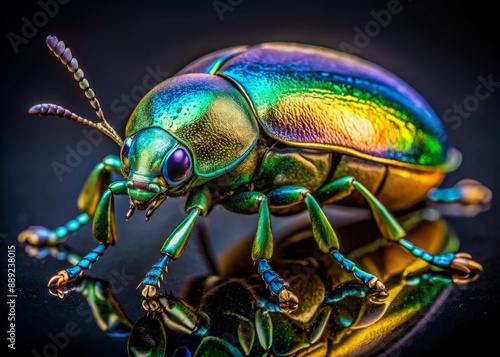 Naklejka premium Vibrant iridescent beetle stands out against a dramatic black backdrop, its...