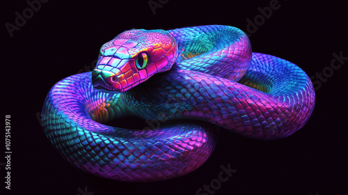 © Ksu_Sha, Obraz premium Vibrant iridescent snake with colorful scales and neon glow coiled on dark background for exotic reptile theme