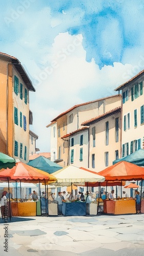 Fototapeta premium Vibrant Italian Market Scene Watercolor Painting of Colorful Stalls and Old Town Buildings under a