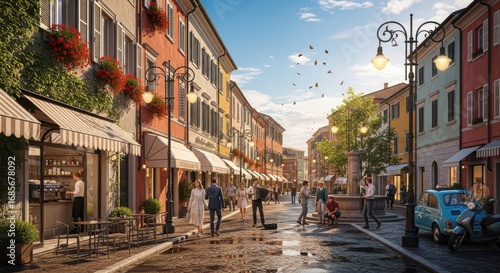 © Rumput, Fototapeta premium Vibrant Italian Streetscape with Cafe Culture and Classic Architecture