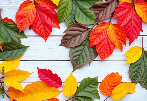 © alain louis, Obraz premium Vibrant jackfruit leaves, various ages, arranged on white wood Seasonal change, nature's cycle, wood texture, vibrant